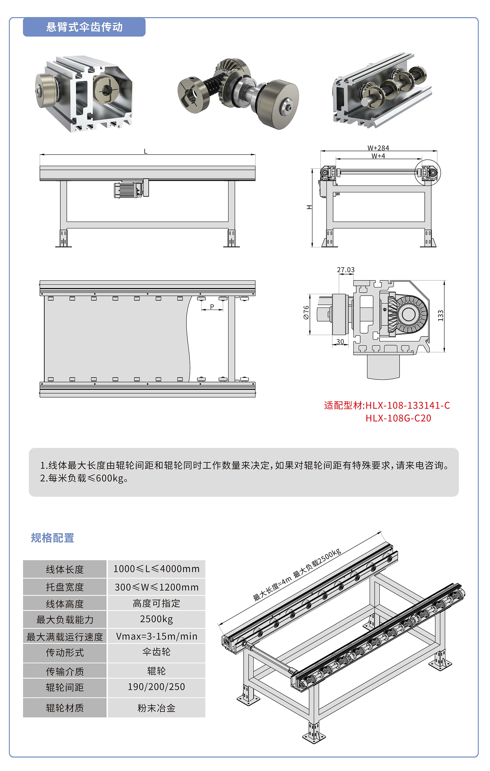 采用133141鋁型材,傘齒驅動,粉末冶金滾輪鑲嵌銅套實現(xiàn)積放功能,負載2500kg/米,最大負載速度15M/min, 輪距190、200、250可選,適用托盤寬度300-1200mm,線體長度范圍1000-4000mm, 高度根據(jù)需求定制.