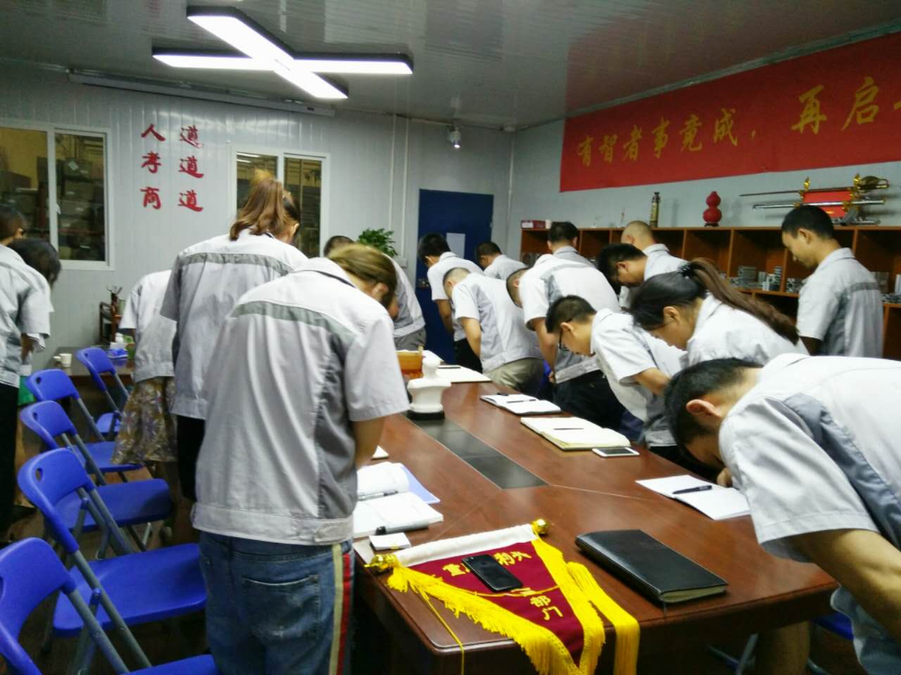 2017年8月1日晚,我司全體人員在匯興學(xué)校召開七月月度大會(huì),依次由自我價(jià)值稱估稱及簽到入場(chǎng)。大會(huì)召開前,全體人員對(duì)企業(yè)三道(人道、孝道、商道)行三鞠躬,隨后進(jìn)入會(huì)議主題。