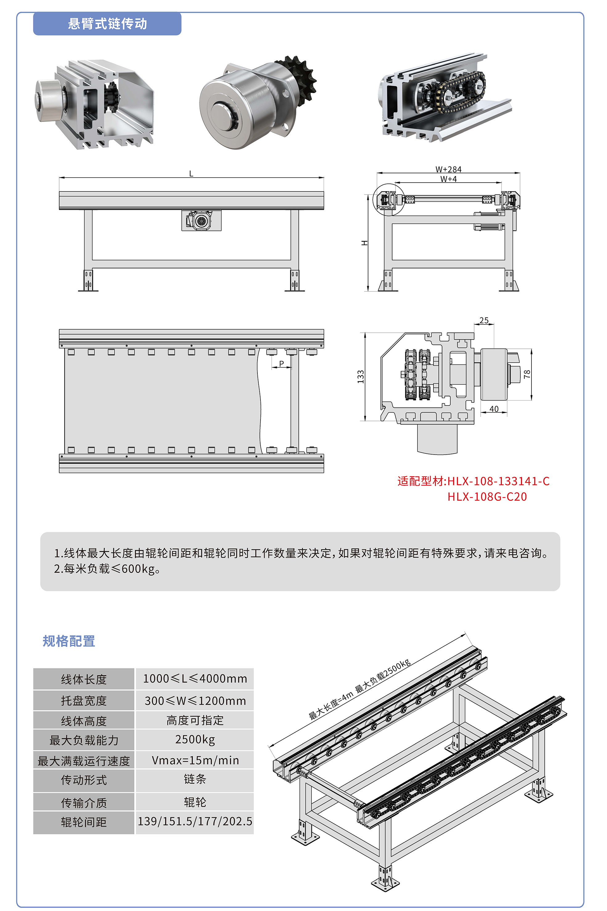 采用133141鋁型材,鏈輪傳動(dòng),鍍鉻滾輪鑲嵌銅套實(shí)現(xiàn)積放功能,負(fù)載2500kg/米,最大負(fù)載速度15M/min, 輪距139、151.5、177、202.5可選,適用托盤(pán)寬度300-1200mm,線體長(zhǎng)度范圍1000-4000mm, 高度根據(jù)需求定制.